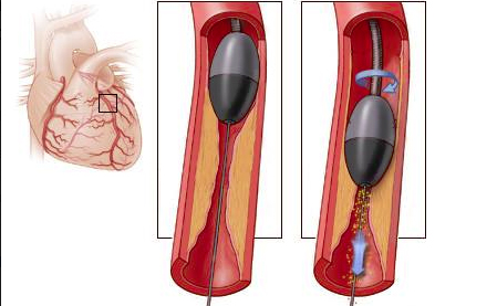 Rotablator is a diamond-tipped, olive-shaped high speed drill, which is used for restoration of patency of the arteries with atherosclerotic calcified plaques. At introduction of the device to the field of stenosis of the coronary artery, the elliptical portion of the catheter head rotating at 180000 rpm, grinds atheroma into million tiny pieces. Unlike the direct atherectomy, rotablation allows to remove (destroy) the plaque immediately. Initial success is achieved in 95% of the cases. However, most of the patients are needed accompanying angioplasty to reach optimal vessel diameter. Contraindications for the method are thrombosis and increased angulation of the coronary artery.