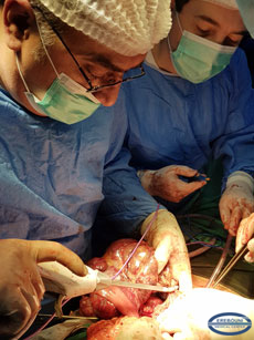 09.01.2018г. в экстренном порядке бригадой хирургов в составе А.Б. Алексаняна, Г.С. Григоряна, анестезиолога А.М. Оганесяна, под руководством к.м.н, доцента А.С. Варданяна было произведено оперативное вмешательство: тотальная срединная лапаротомия, разъединение спаек, радикальное удаление опухоли с высокой резекцией тощей кишки и анастомозом конец-в-конец, санация и дренирование брюшной полости.Операция производилась с применением новых технологий LigaSure.